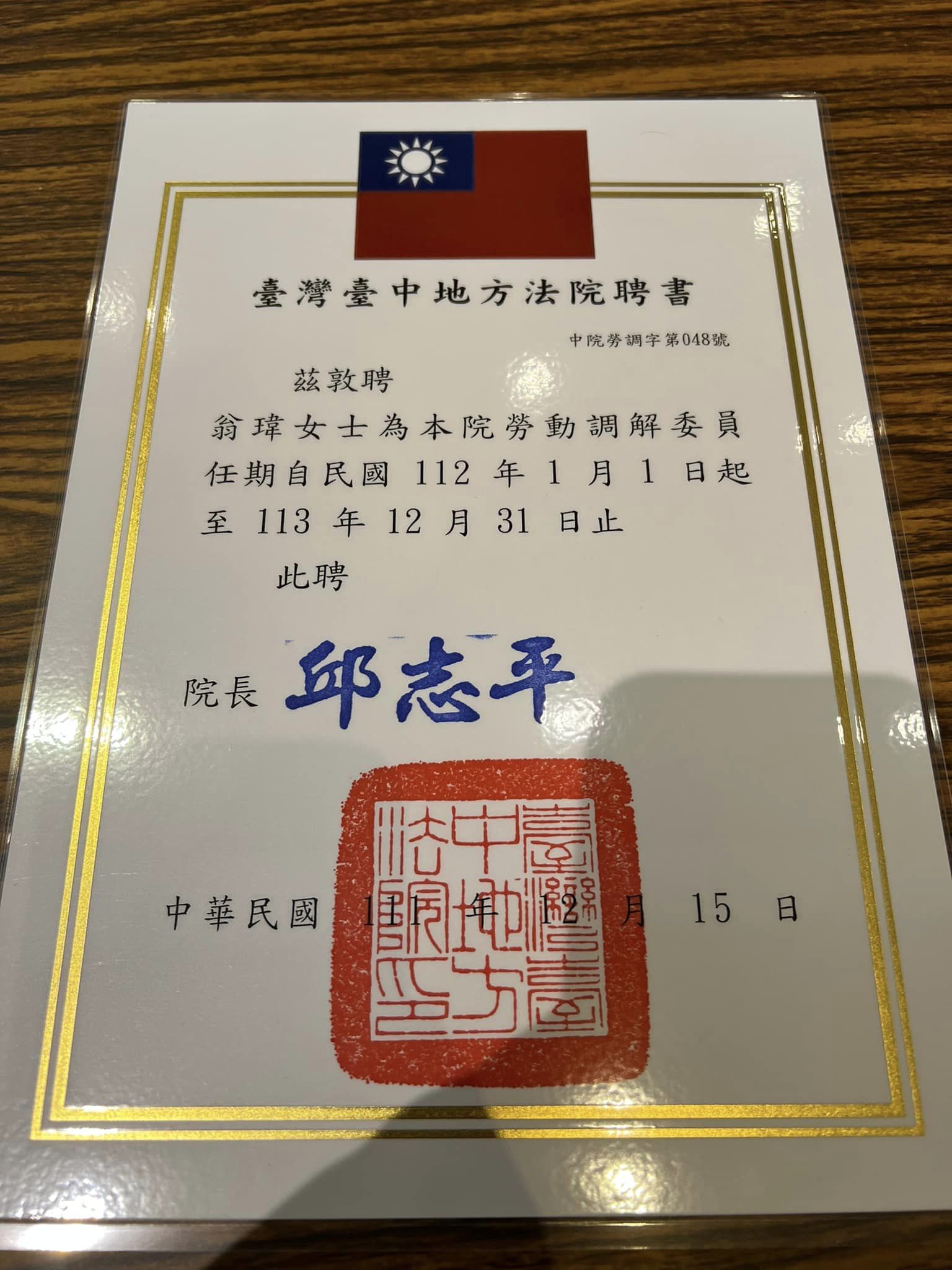 111.12.27臺灣台中地方法院聘為勞動調解委員