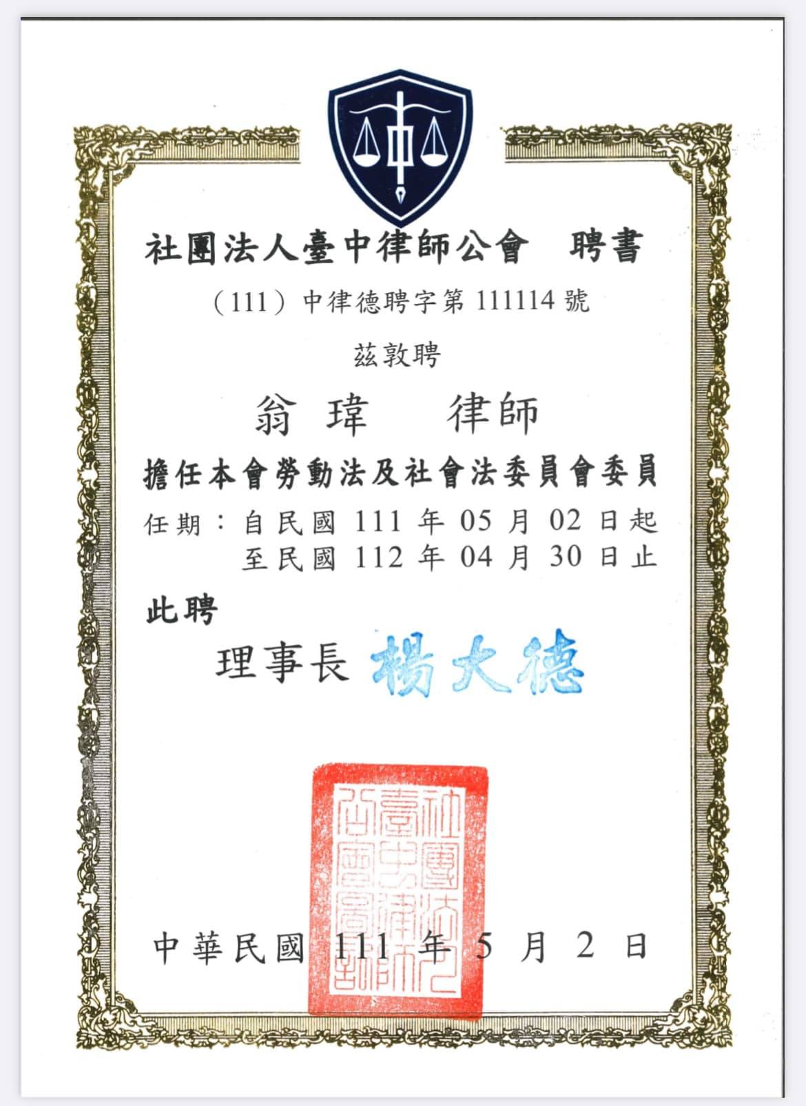 111.6.10台中律師公會聘任為勞動法及社會法委員會委員
