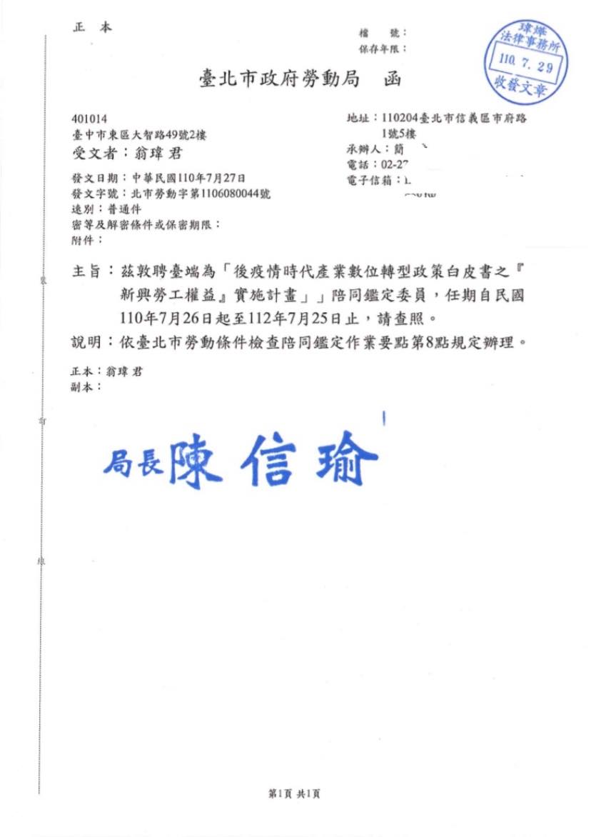 本所所長翁瑋律師獲聘擔任臺北市政府勞動局「後疫情時代產業數位轉型政策白皮書之《新興勞工權益》實施計畫」陪同鑑定員,任期自民國110年7月26日起至112年7月25日止