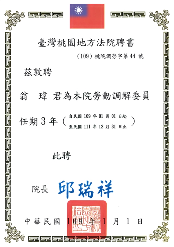 本所所長翁瑋律師受聘擔任台灣桃園地方法院勞動調解委員,任期自109年1月1日起至111年121月31日止,期能妥適、專業、迅速、有效、平等處理勞動事件,以保障勞資雙方權益及促進勞資關係和諧。
